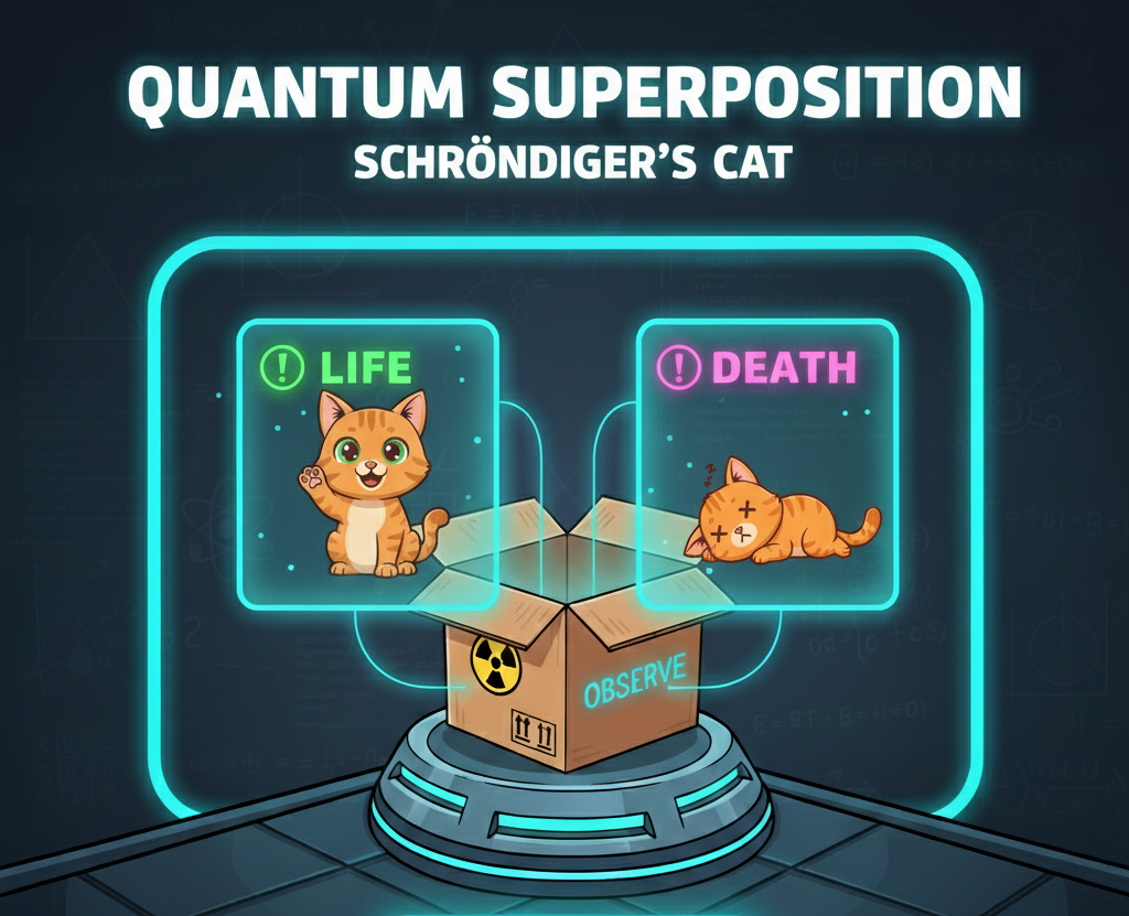 Aprenda de forma divertida e simples sobre o princípio da Superposição Quântica, , com o famoso experimento do Gato de Schrödinger.